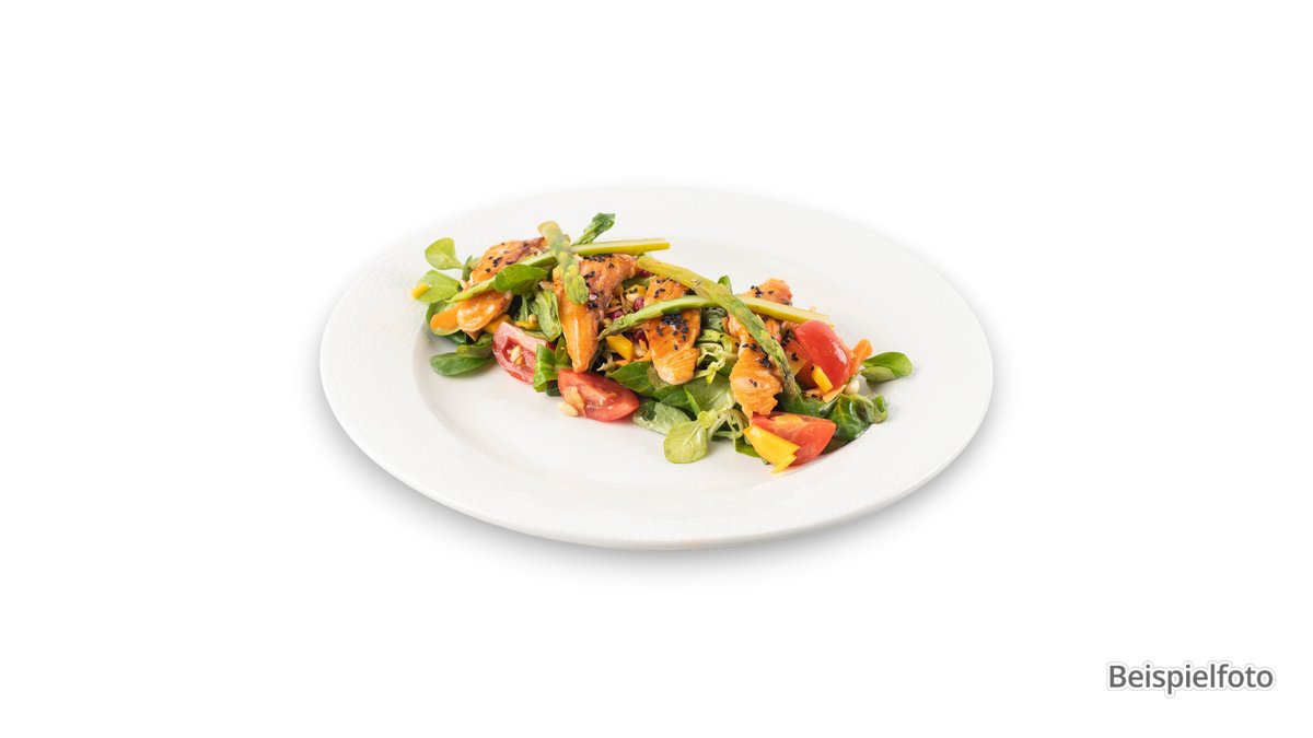 scharf angemacht mit Eisbergsalat, roten Zwiebeln, Paprika, Tomaten, frischen Kräutern und rohem Lachs
