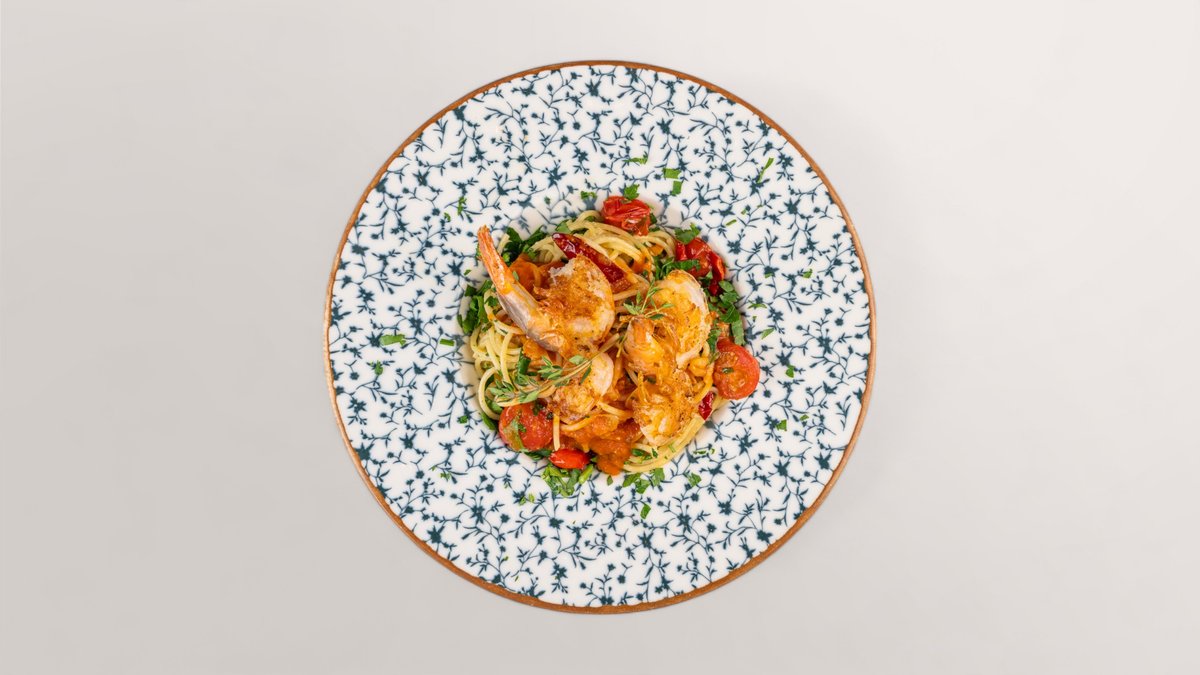 mit Riesengarnelen, Öl, Knoblauch, Kirschtomaten und Peperoncini