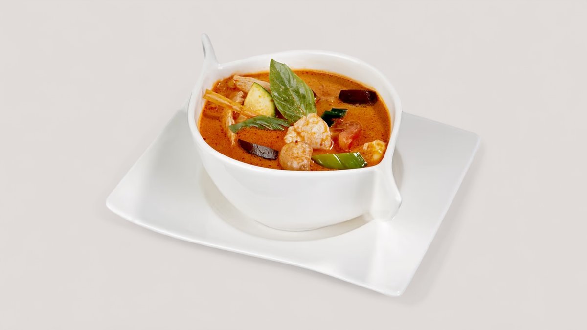 knackiges Gemüse mit roter Currysoße, Champignons, Zucchini, grünen Bohnen, Thai-Reis und einer Zutat deiner Wahl