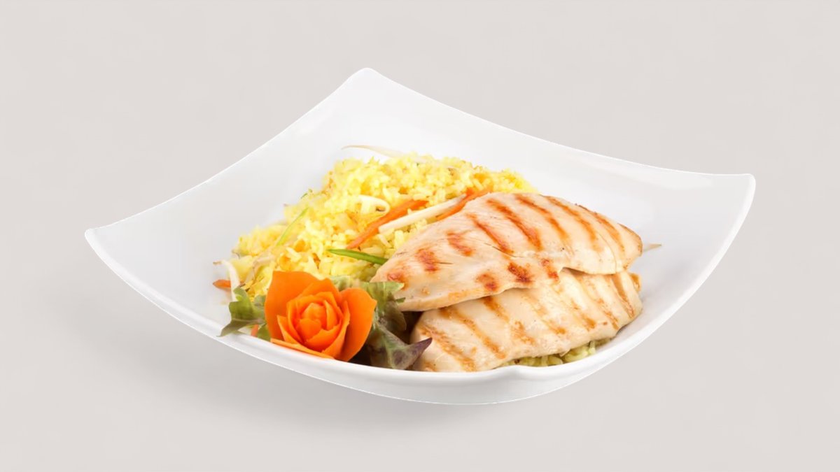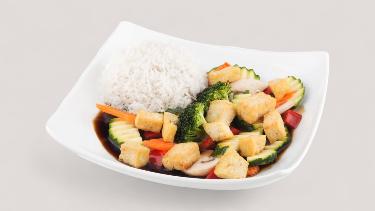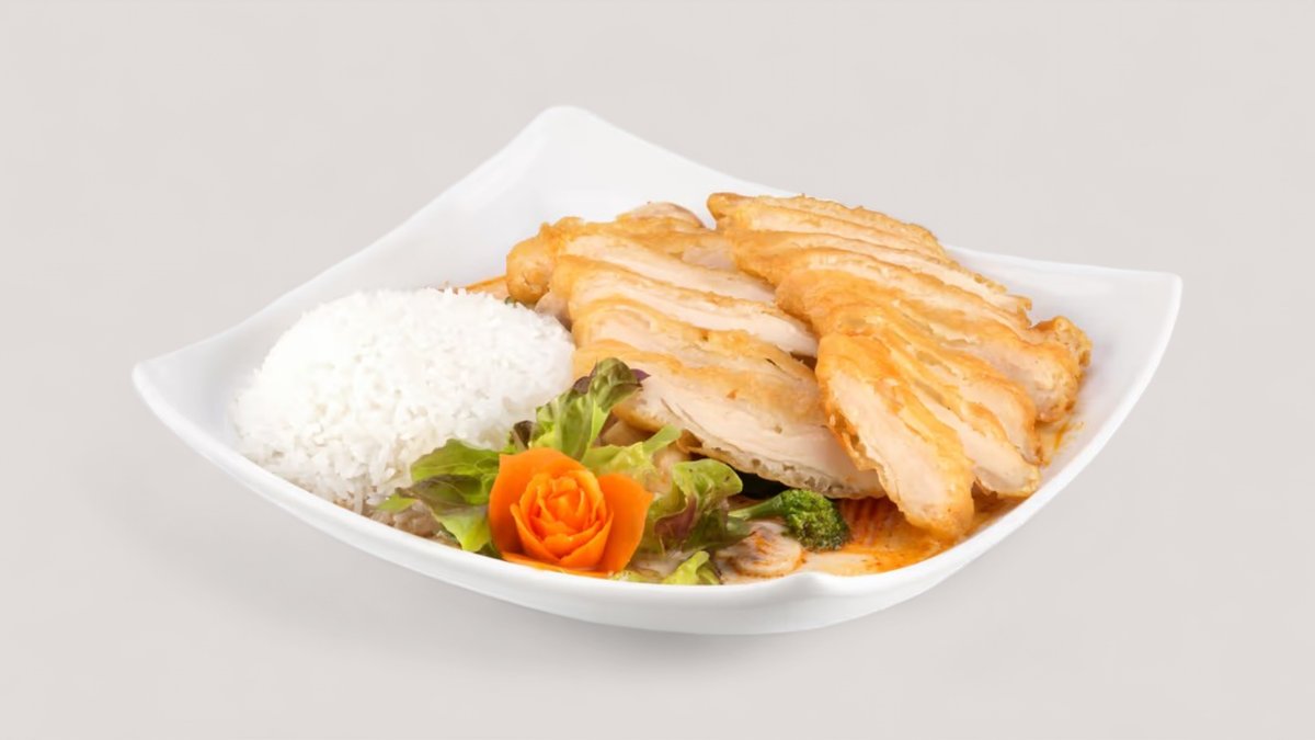 knackiges Gemüse mit Mango-Currysoße, Thai-Reis und einer Zutat deiner Wahl