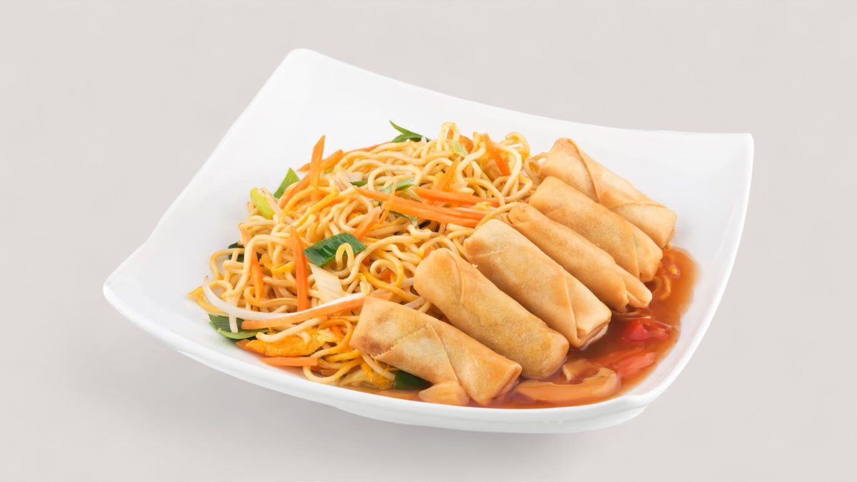 gebratene Nudeln mit Mini-Frühlingsrollen, Porree, Karottenstreifen und Sojasprossen