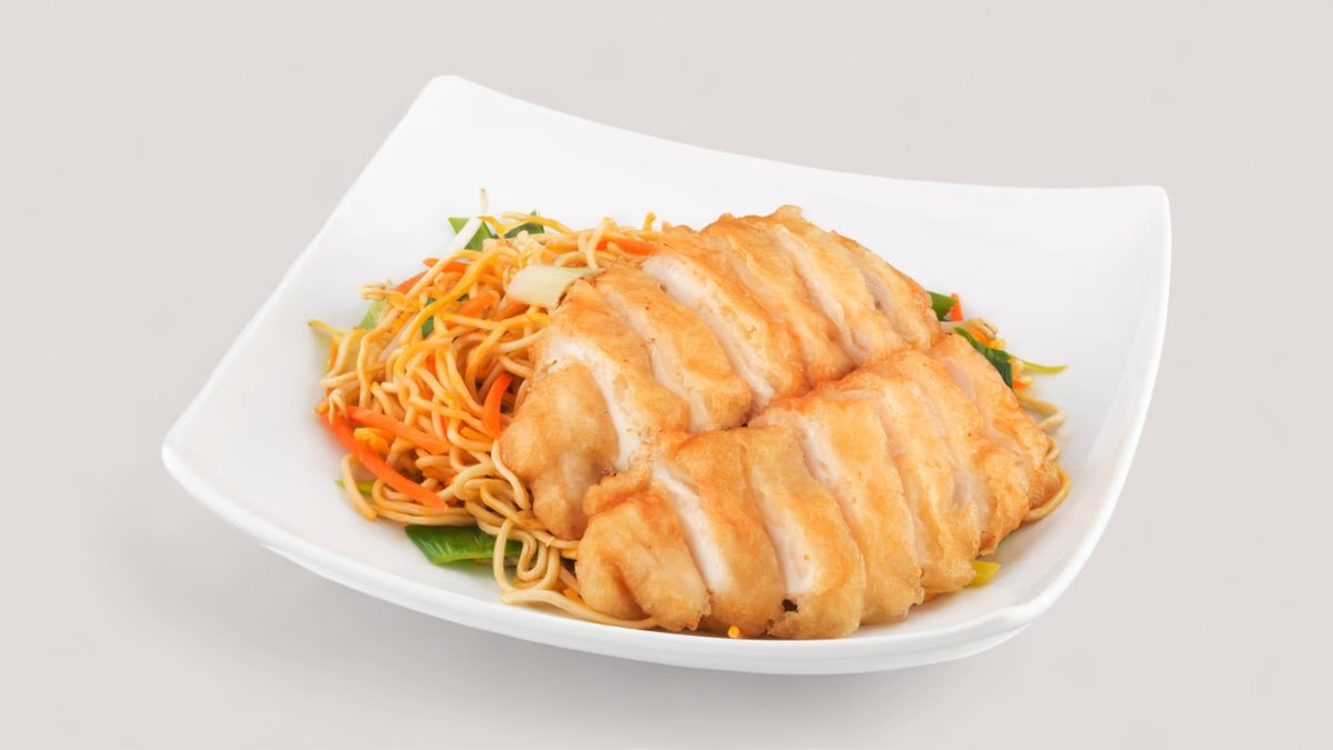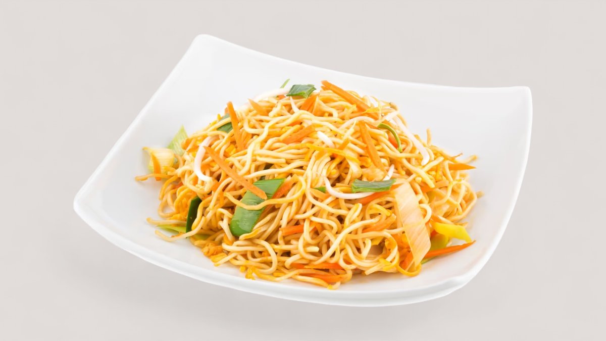 gebratene Nudeln mit Mini-Frühlingsrollen, Porree, Karottenstreifen, Sojasprossen und einer Soße deiner Wahl