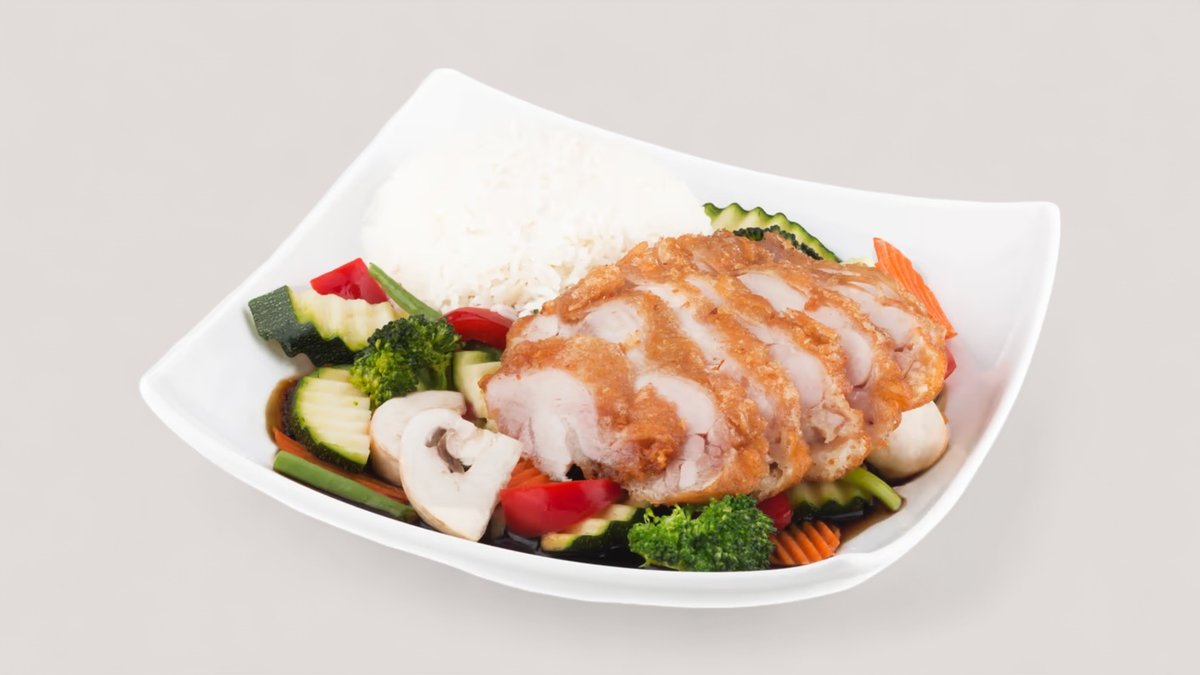 knackiges Gemüse mit Viet-Reis, Crispy Chicken und einer Soße nach Wahl