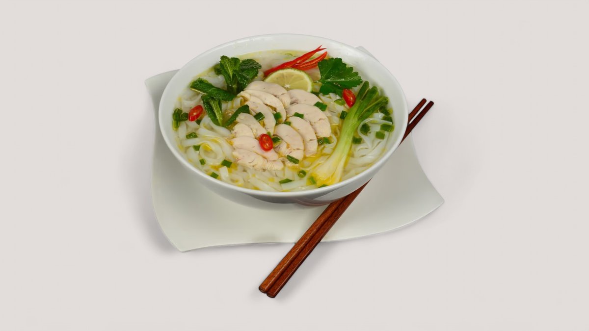 Reisnudelsuppe mit gewürztem Hähnchenfleisch, Ingwer, verschiedenem Gemüse wie Sojasprossen, Zitronenscheiben, Frühlingszwiebeln, Chili und Koriander
