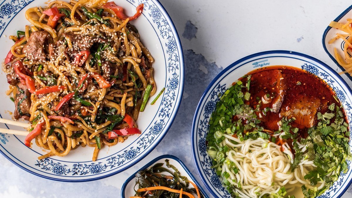 asiatische Broccoliblätter, dicke Glasnudeln, Shiitakepilzen und Sezuan Pfeffer