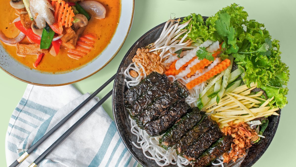 Reisnudeln mit Frühlingsrollen, Kräutern und Fischsoße