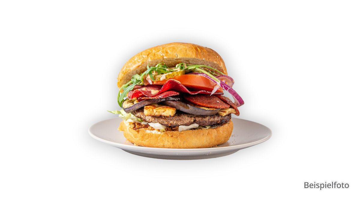 mit einem herzhaftem veganen Burger und veganem Burgerbrot