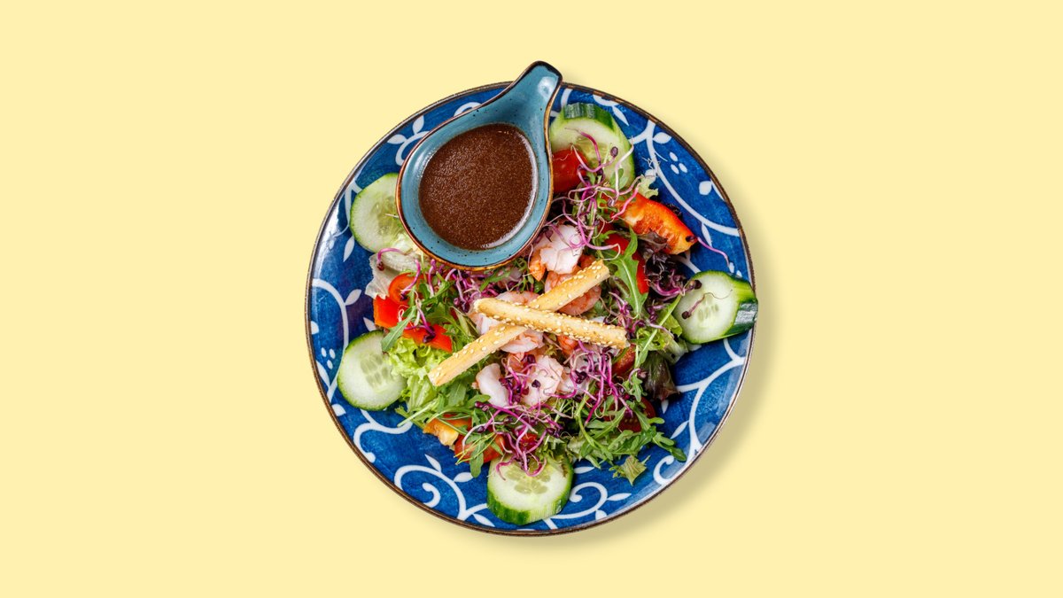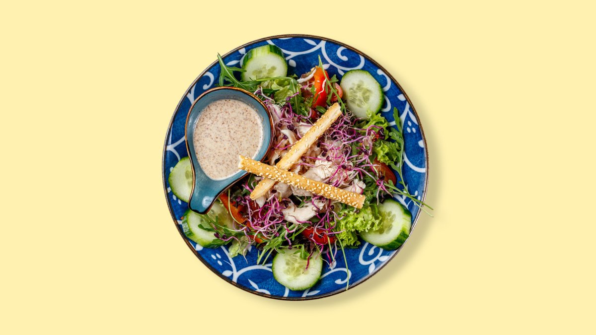 alle Salate werden mit gemischtem Blattsalat, Gurken, Paprika, Kirschtomaten, Avocado und Wasabi-Sprossen zubereitet sowie mit einer Brotstange serviert
