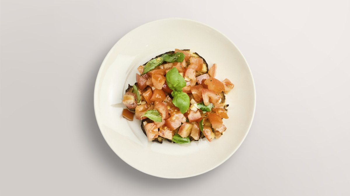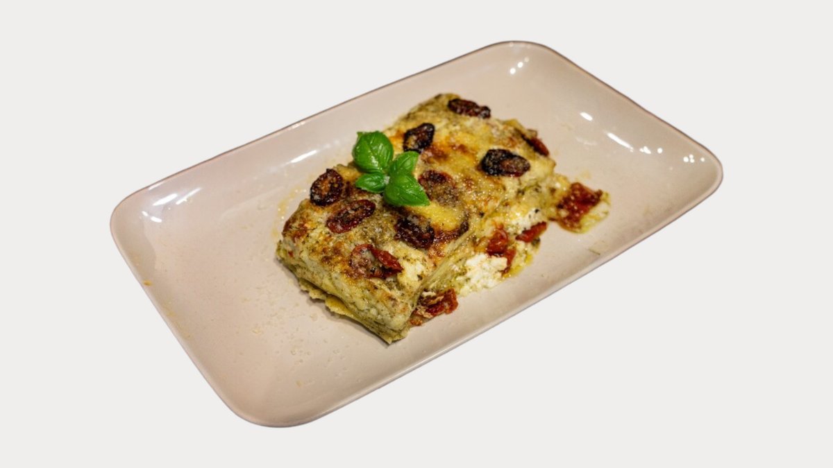 mit Béchamelsoße, Basilikumpesto, Büffel-Mozzarella und Kirschtomaten-Confit