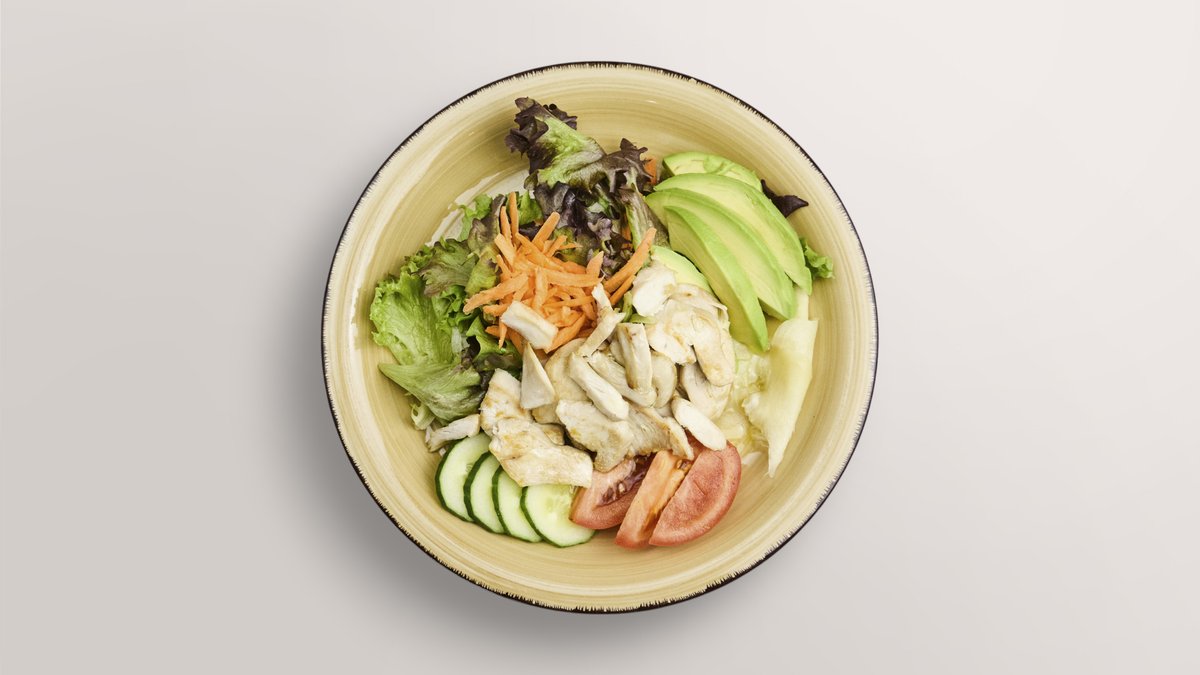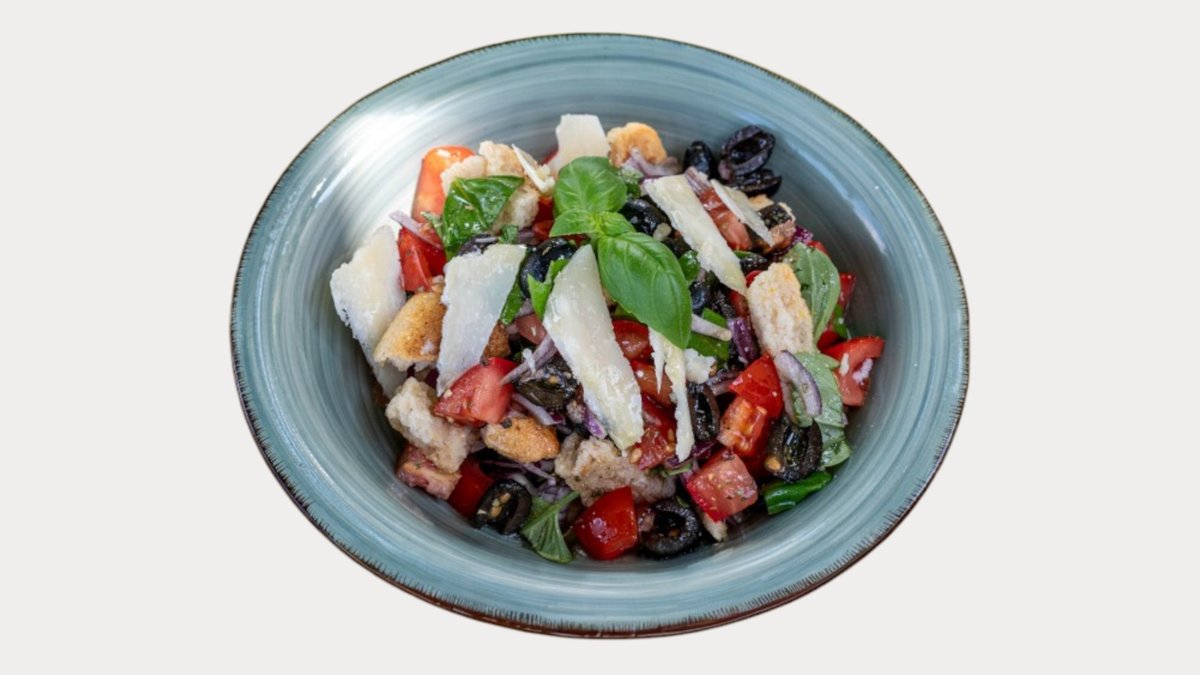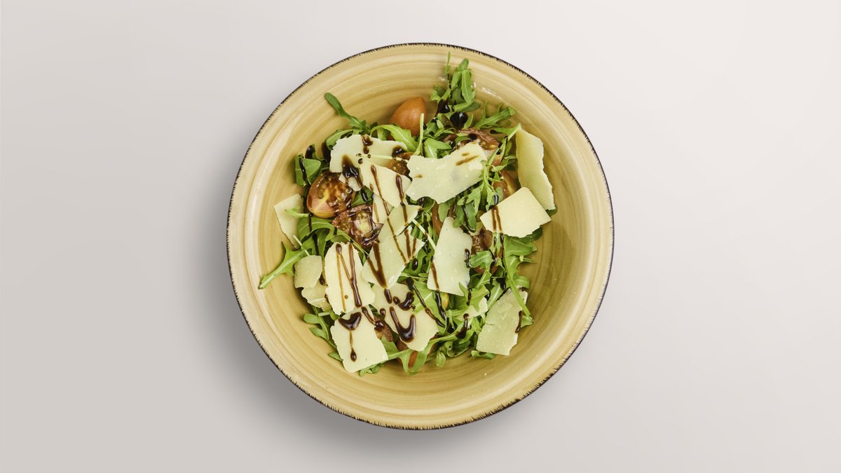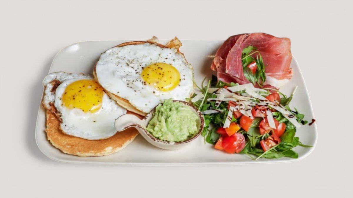 mit 2 Spiegeleiern, Parmaschinken aus Schweinefleisch, Rucola, Kirschtomaten, gehobeltem Parmesan und Thymian-Avocado-Pesto