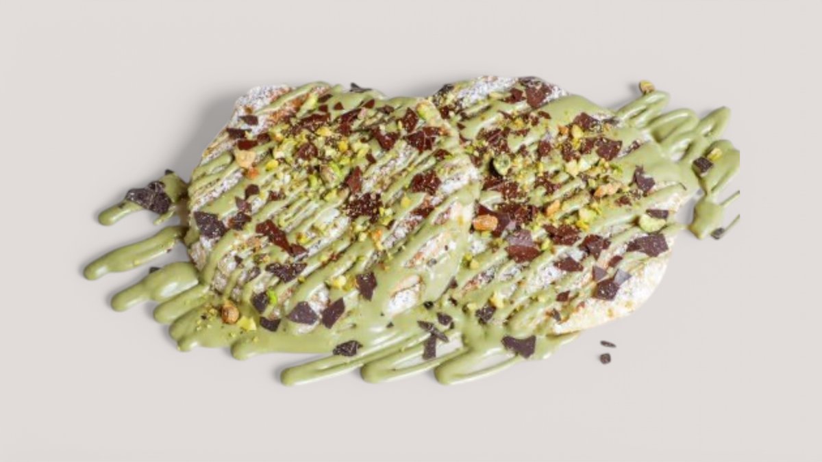 mit weißer Schokoladencreme, Pistazienkrümeln und Puderzucker, serviert in einer Größe deiner Wahl Das Gericht wurde mit Schokolade zubereitet und kann Spuren von verschiedenen Nüssen enthalten