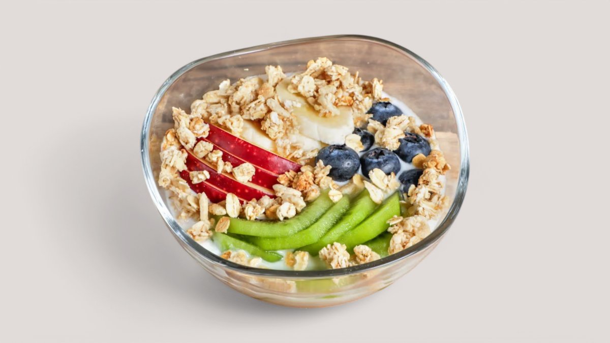 mit Müsli, Nüssen und frischem, getrocknetem Obst