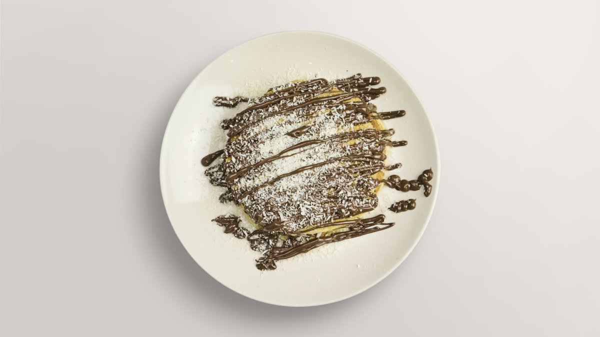 mit dunkler Schokoladencreme, Kokosraspeln und Puderzucker, serviert in einer Größe deiner Wahl Das Gericht wurde mit Schokolade zubereitet und kann Spuren von verschiedenen Nüssen enthalten