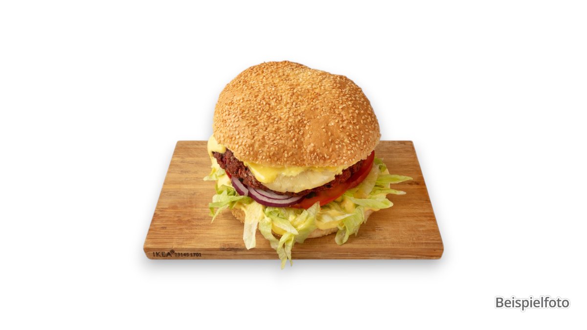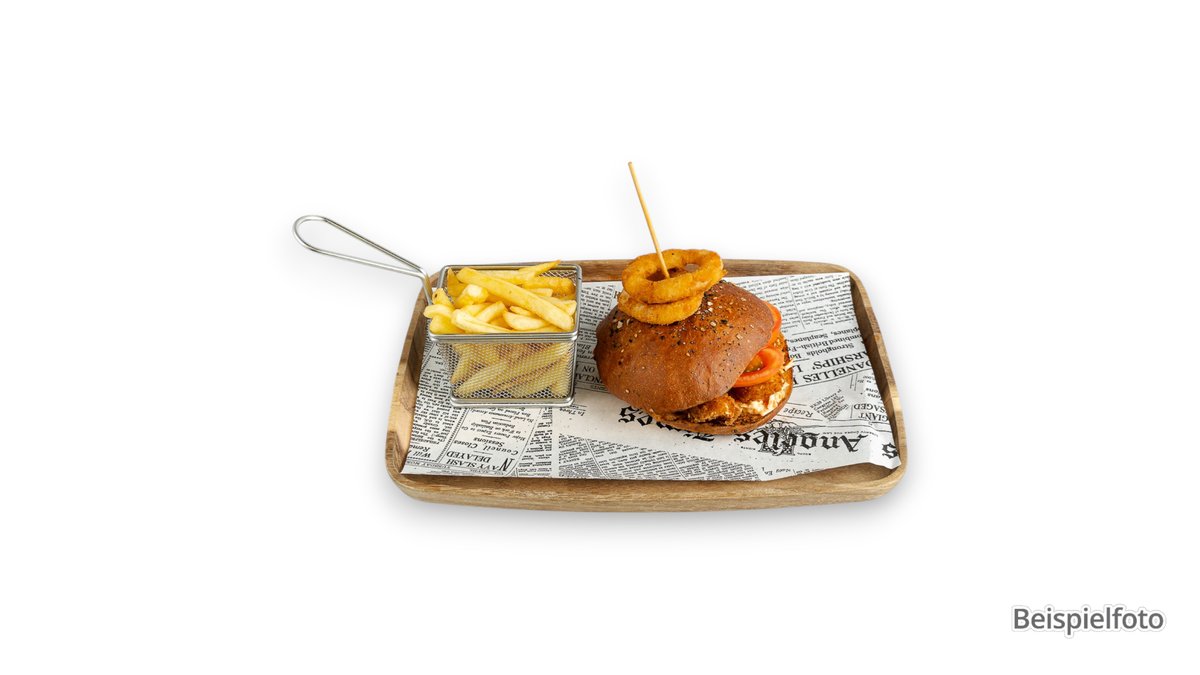mit panierten, zusammengefügten Hähnchenbrustfiletstücken, Eisbergsalat, roten Zwiebeln, Strauchtomaten, knackigen Essiggurken und Mayonnaise