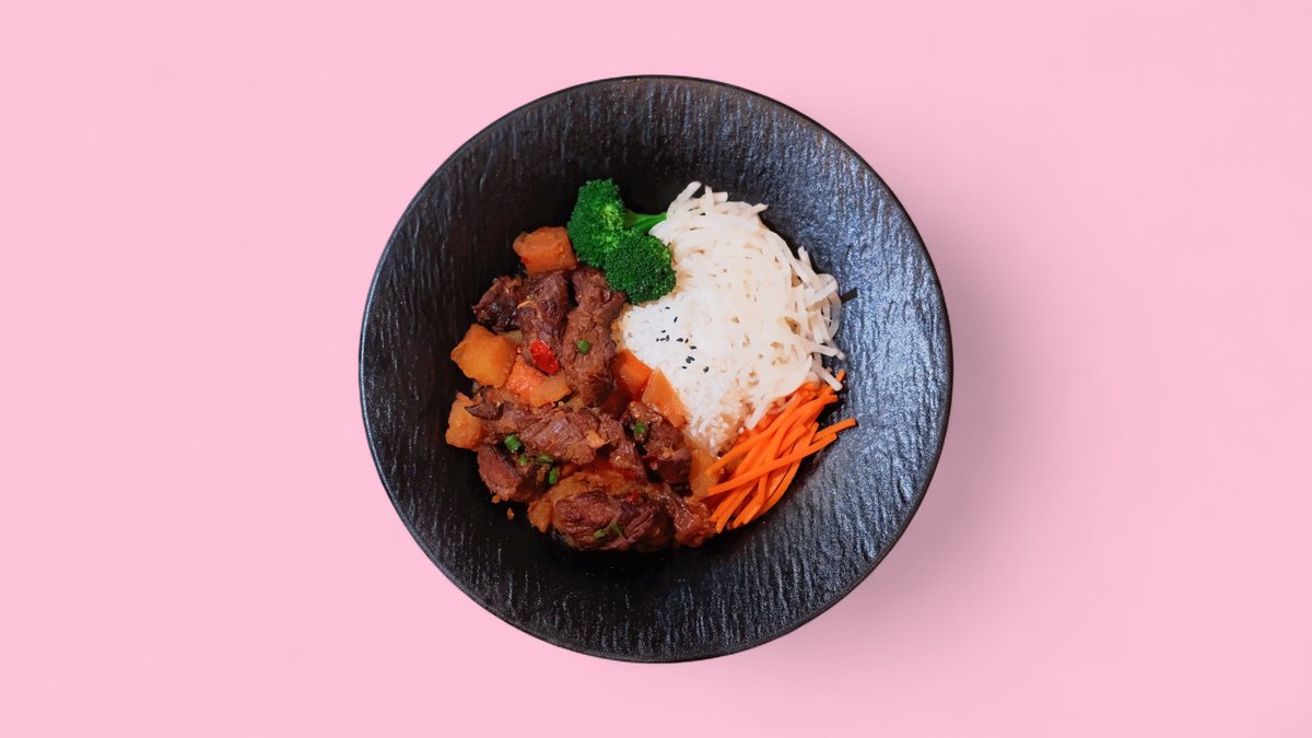 Rindfleisch in mildem Curry mit cremiger Sauce, angenehm gewürzt und nicht scharf, serviert als Rice Bowl mit Reis und Gemüsebeilagen. 温和咖喱牛肉,口味柔和不辣,搭配米饭和蔬菜配菜,吃起来轻松又饱腹。 Beef in a mild curry sauce, served as a rice bowl with rice and vegetables.