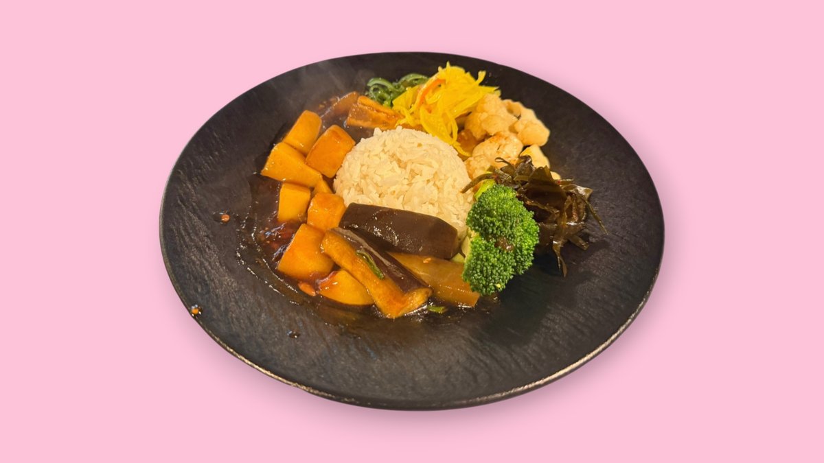 Gemüse in mildem Curry mit cremiger Sauce, als Rice Bowl mit Reis und Beilagen serviert. Leicht und ausgewogen. 咖喱素菜,口味温和,搭配米饭和当日配菜,清爽又均衡。 Vegetable curry, served as a rice bowl with rice and vegetables.