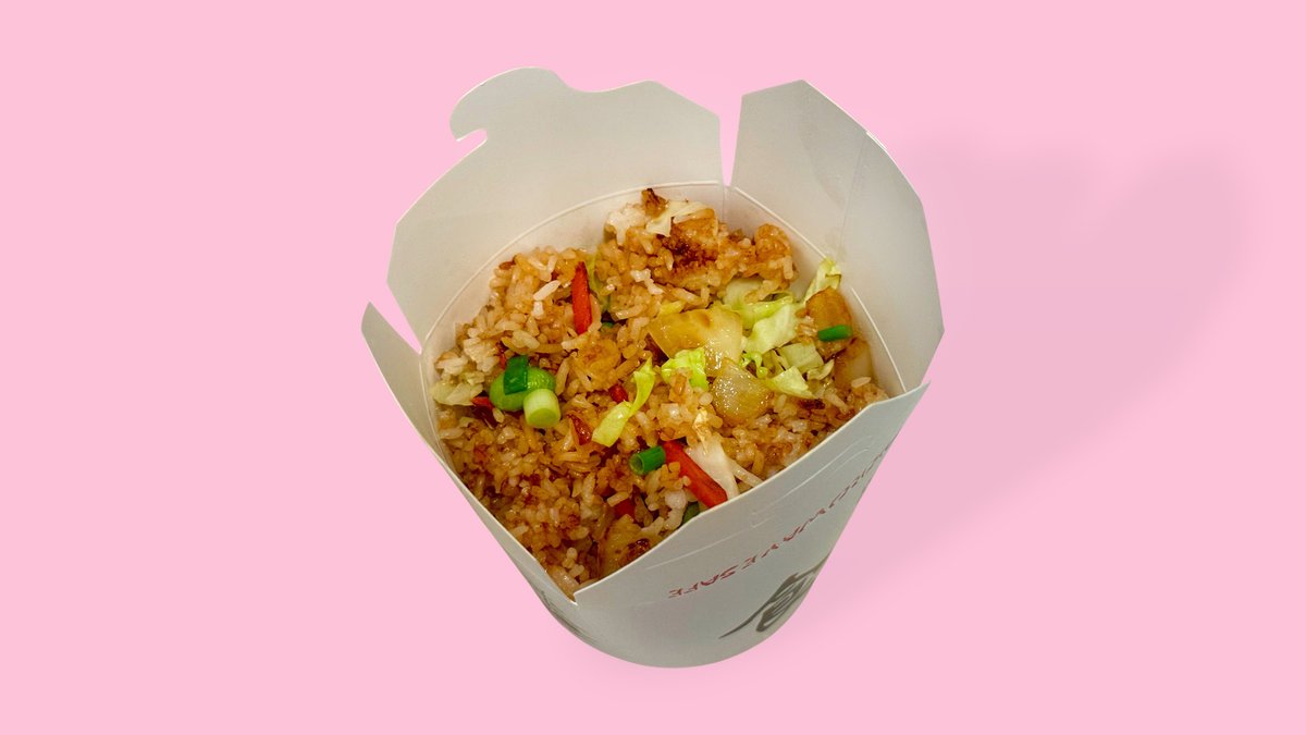 Gebratener Reis mit Gemüse, als Bowl serviert. 素菜炒饭,配蔬菜配菜,清爽饱腹。 Vegetable fried rice, served as a bowl.