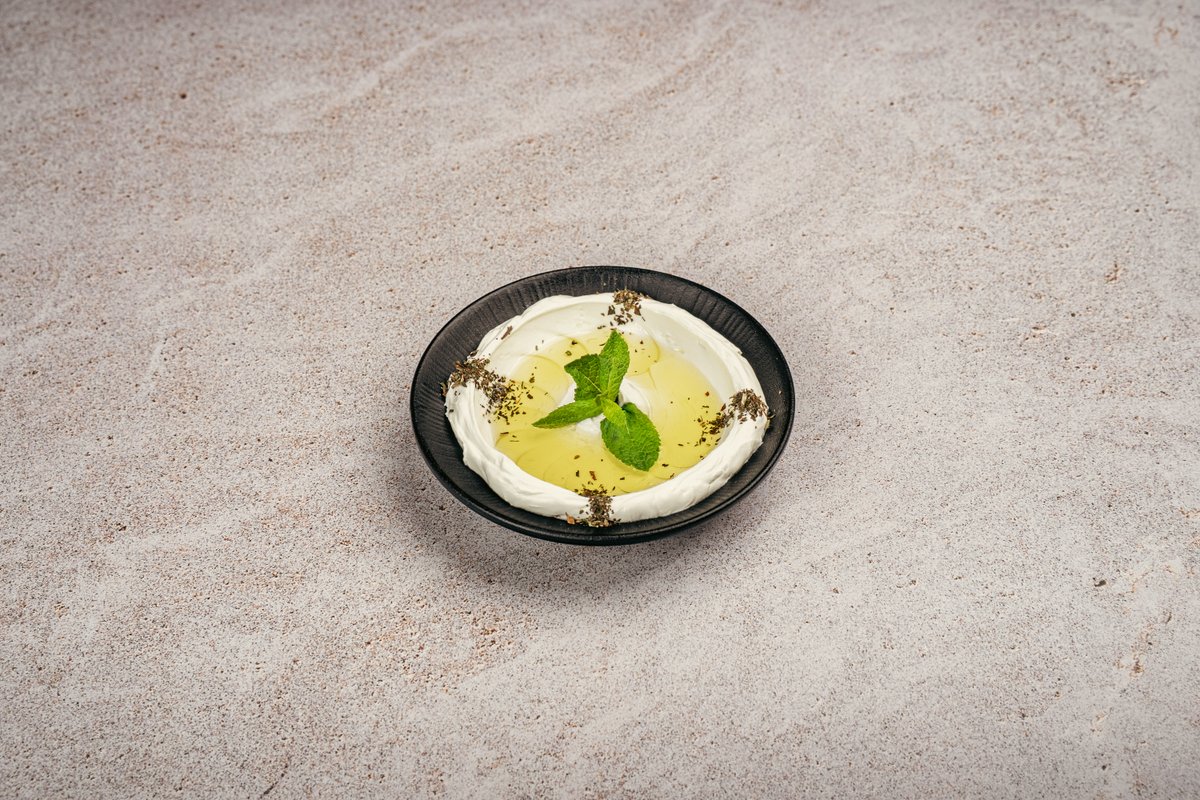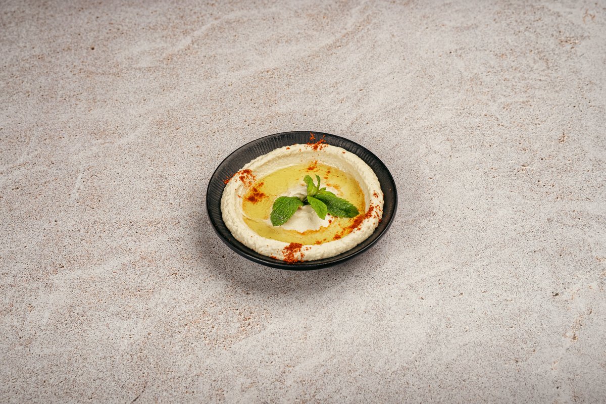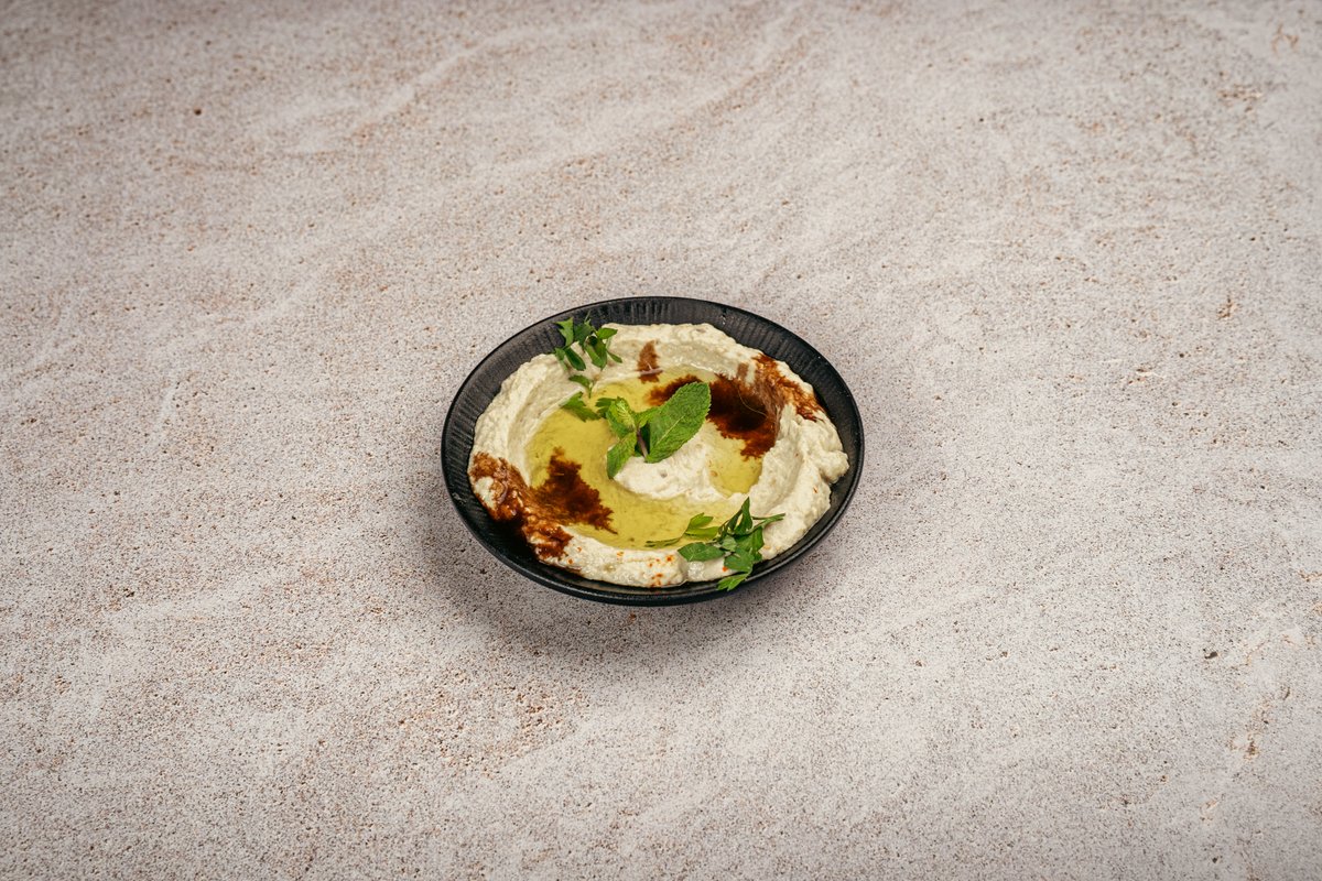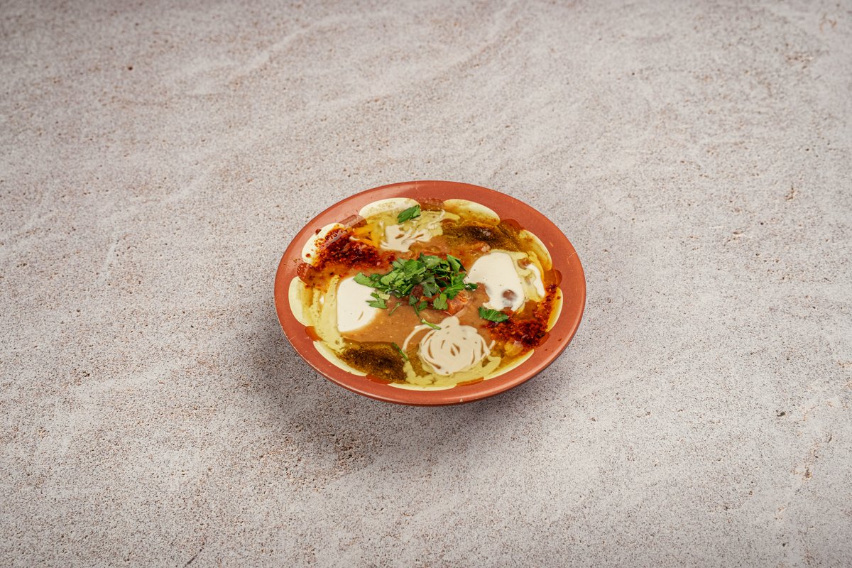 mit Hummus, Foul, Auberginencreme, Linsensuppe, Falafel und einem Fladenbrot