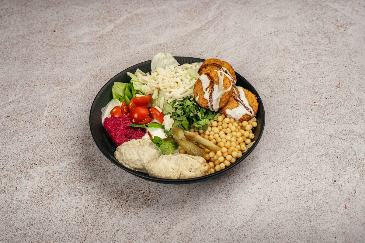 alle Gerichte werden mit Salat, Käse, Granatapfelsoße, Joghurtsoße, Tahinisoße und Tomaten
