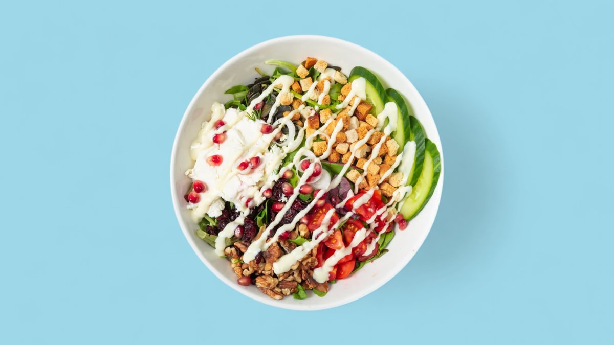 alle Salate werden mit Tomaten, Gurken, Walnüssen, Minze, Kürbiskernen, Granatapfel, Cranberries, geröstetem Brot, Dill, Sesam, Mom's Soße und einem Dressing deiner Wahl zubereitet („Himbeer Quinoa Salat” wird ohne Tomaten, Gurken, Walnüssen, Kürbiskernen, Cranberries, geröstetem Brot, Dill und Mom's Soße zubereitet)