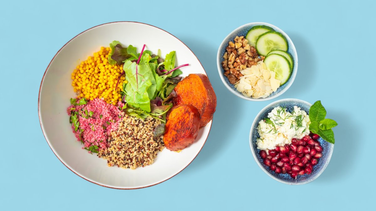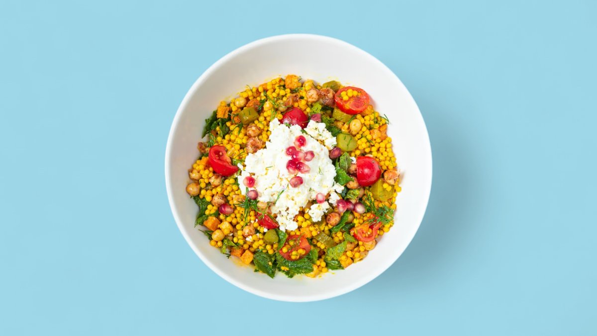mit Kurkuma Couscous, Tomaten, Walnüssen, Cornichons, Minze, Dill, Kürbiskernen, Kichererbsen, Schafskäse, geröstetem Brot, Sesam und Sesamsoße