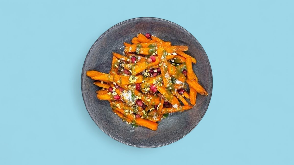 Süßkartoffel-Pommes mit Zimt-Zucker, Kokos, Haselnüssen, Pistaziencreme und Granatapfelkernen