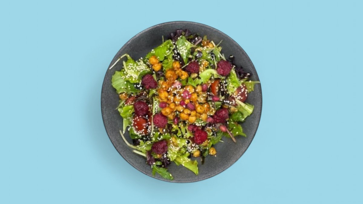 mit gemischtem Salat, Minze, Kichererbsen, Sesam, Kürkiskerne, Walnuss, Himbeer, Granatapfel, Tomaten, Olivenöl und Balsamico