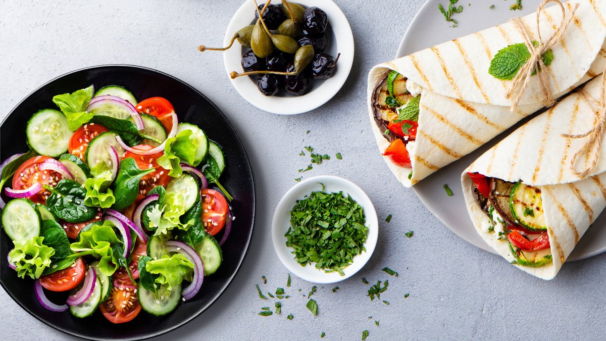 alle Wraps werden mit Salat, Minze, Tomaten, Dill, Cornichons, Granatapfel und einem Dressing deiner Wahl zubereitet („Falloumi Wrap” wird ohne ein Dressing deiner Wahl zubereitet)