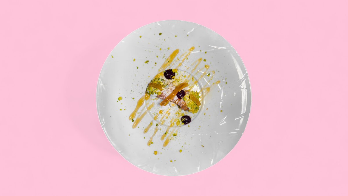 mit Mango, gesalzenem Pistazien Crumble, Mayonnaise vom gerösteten Sesam, Pfeffer und Holzkohle