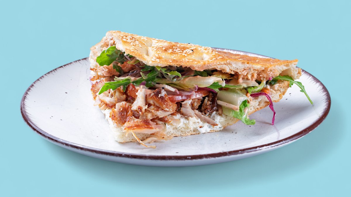 mit halbem Fladenbrot und Drehspießfleisch aus Hähnchen und Pute