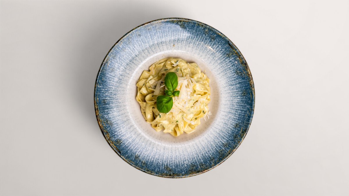 Tagliatelle mit Basilikumpesto, Pinienkernen und Parmigiano Reggiano