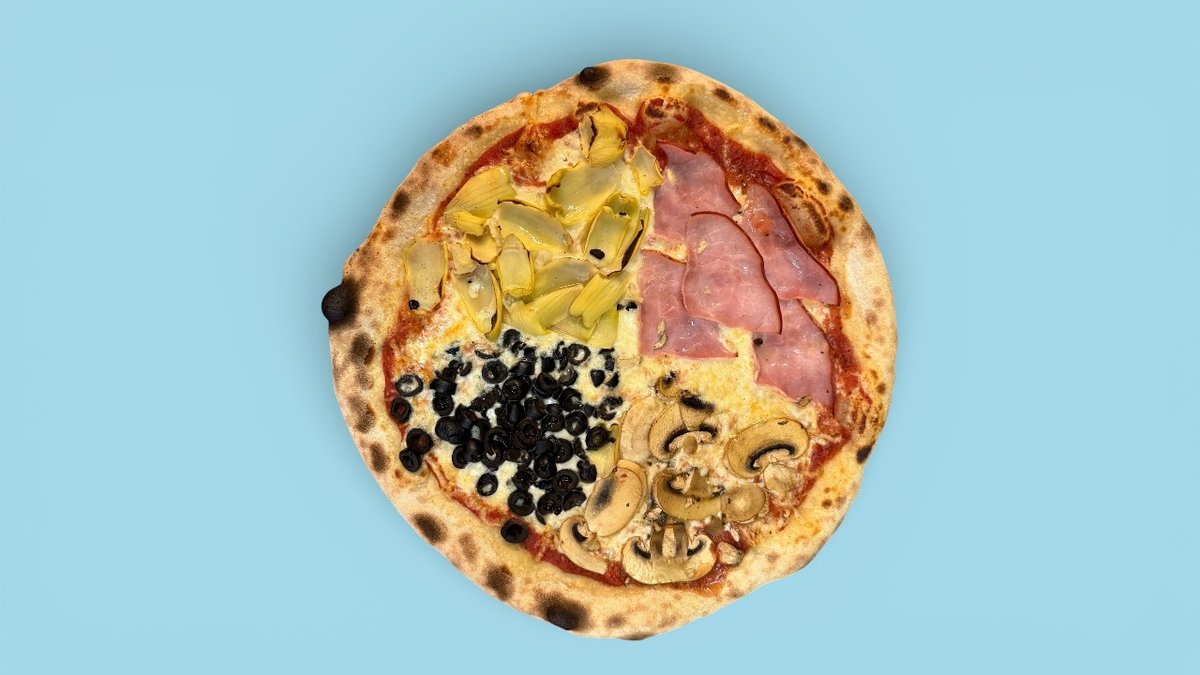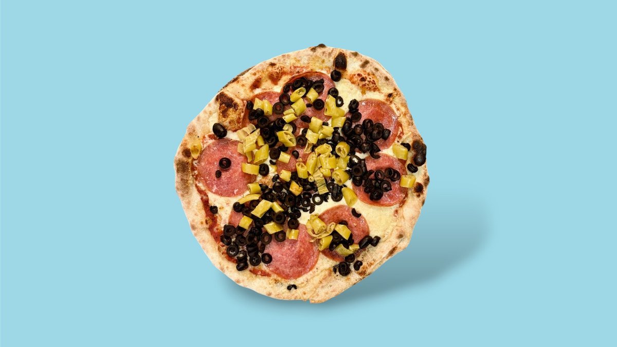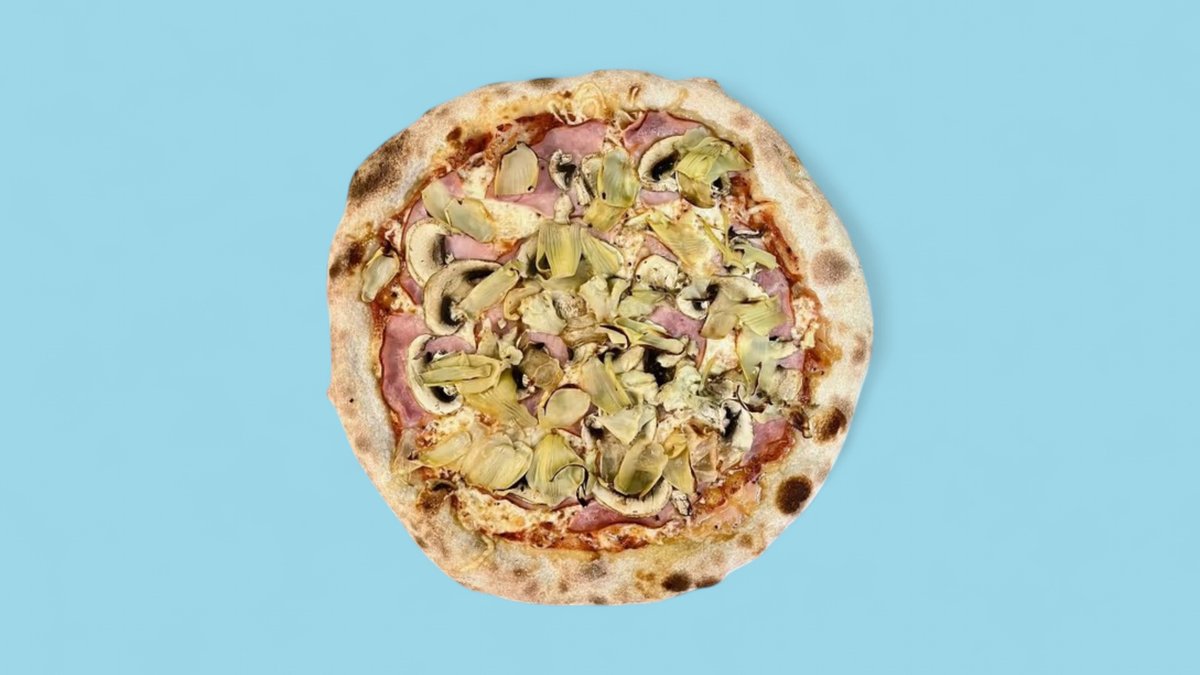 mit Schweinesalami, Hinterschinken vom Schwein, Champignons, Artischocken, Peperoni, Kapern, Oliven und Paprika