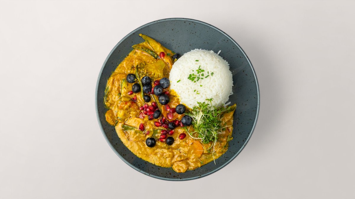 alle Gerichte werden mit frischem Gemüse, fruchtig-pikanter Currysoße und Basmati Reis serviert