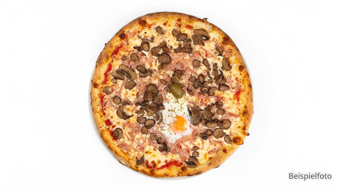 mit frischen Champignons, Formfleisch-Schinken vom Putenfleisch, aus Fleischteilen zusammengefügt, Zwiebeln, Knoblauch und Oliven
