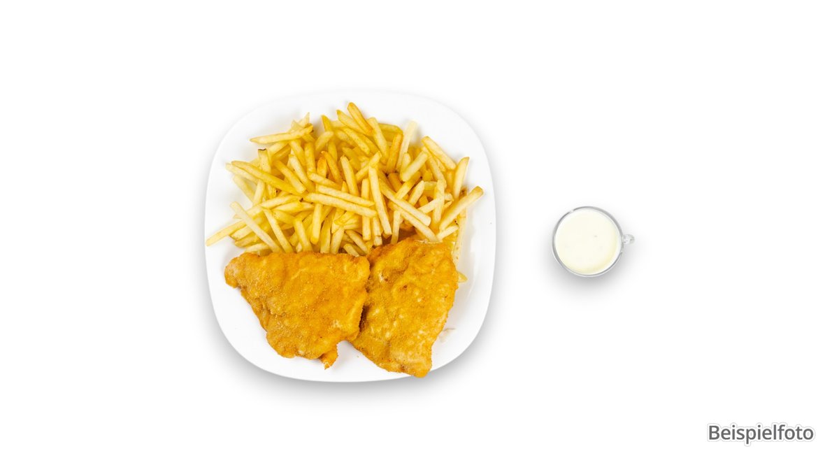 2 Stück paniertes Hähnchenschnitzel, gefüllt mit Putenschinken und Käse, serviert mit Pommes frites und Zitronen