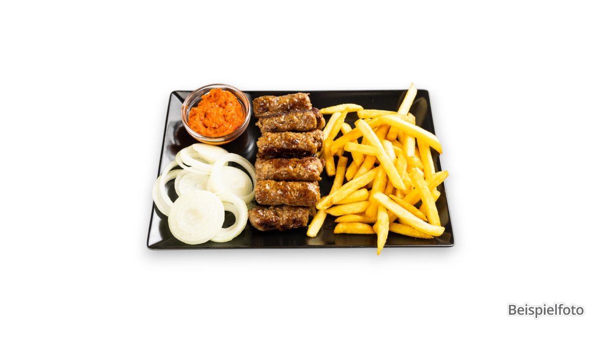mit Pommes frites, Tomaten, Salat, Zwiebeln und Tsatsiki