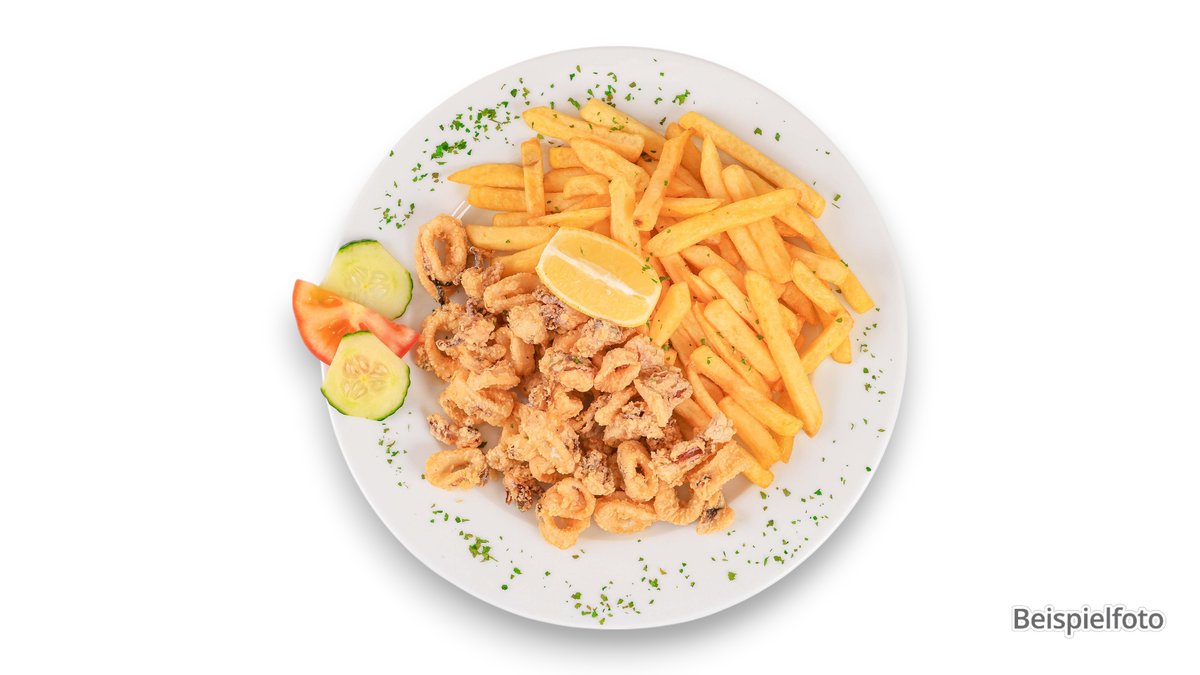 frittierte Tintenfischringe in Brotteig mit Remoulade, Zitronen und Pommes frites