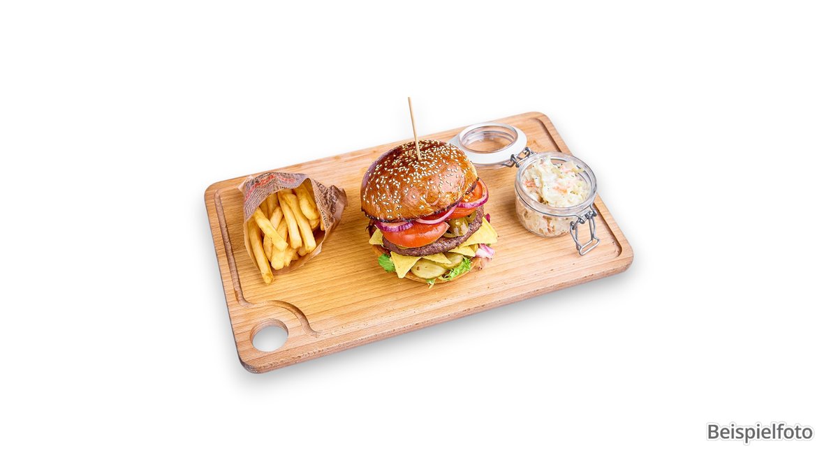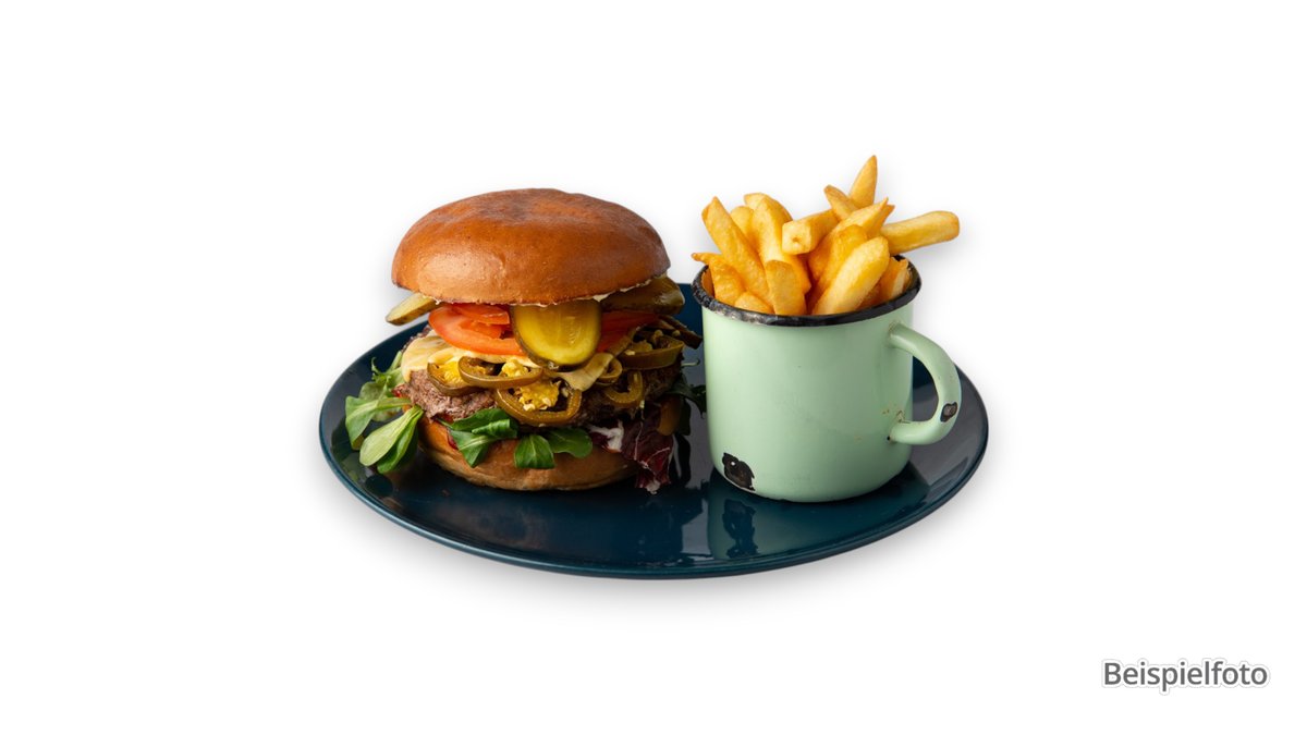alle Burger-Menüs werden mit Tomaten, Sauergurken, Salat und Burgersoße zubereitet und mit Pommes frites, Ketchup und Mayonnaise serviert