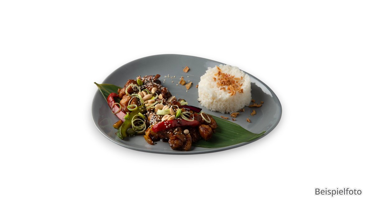 Alle Hauptgerichte werden mit Reis serviert (Nudelgerichte ausgenommen)
