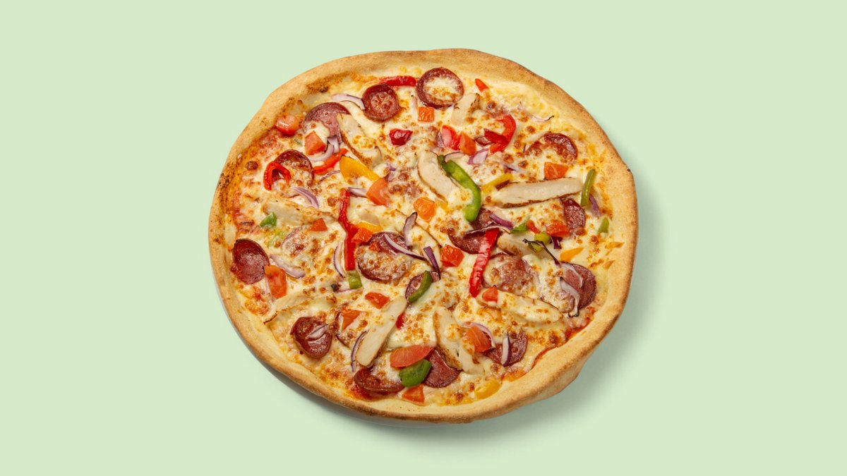 mit Hähnchen, Sucuk vom Rind, roten Zwiebeln, Paprika und Tomaten