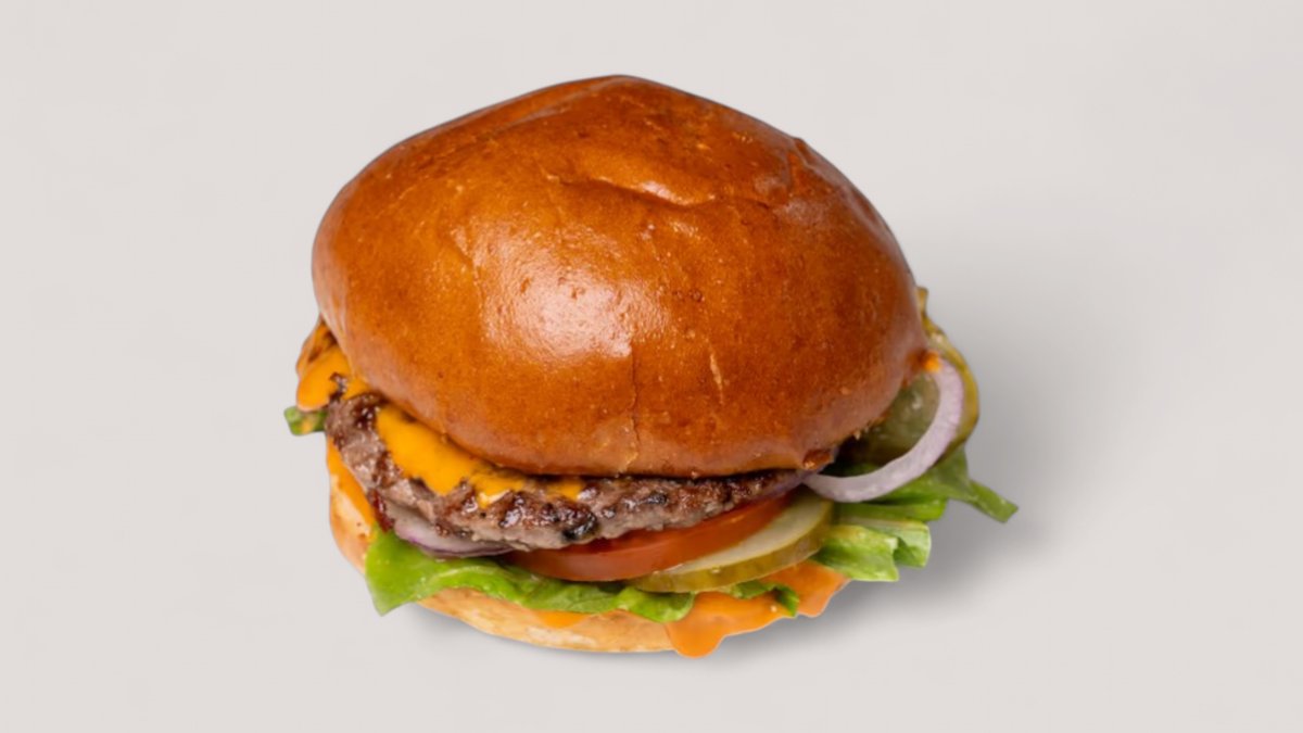 mit Cheddar, Salat, Tomaten, grillen Zwiebeln, Sauergurken und Burgersoße