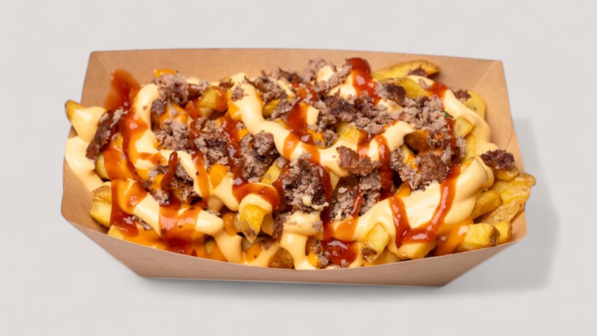 Pommes frites toppet mit cremiger Käsesoße, Rinderack, Chilisoße und scharfem Jalapeños