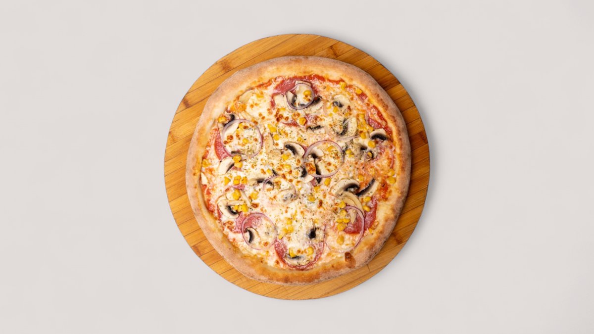 mit Rindersalami, Zwiebeln, Mais und Champignons