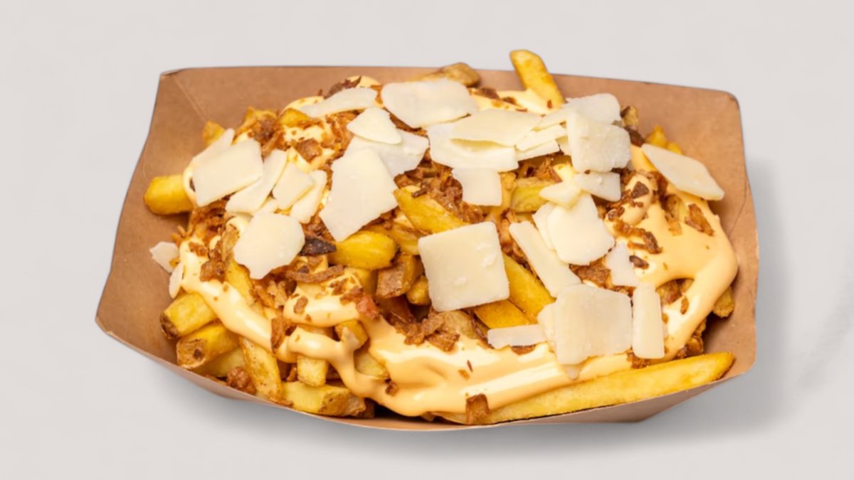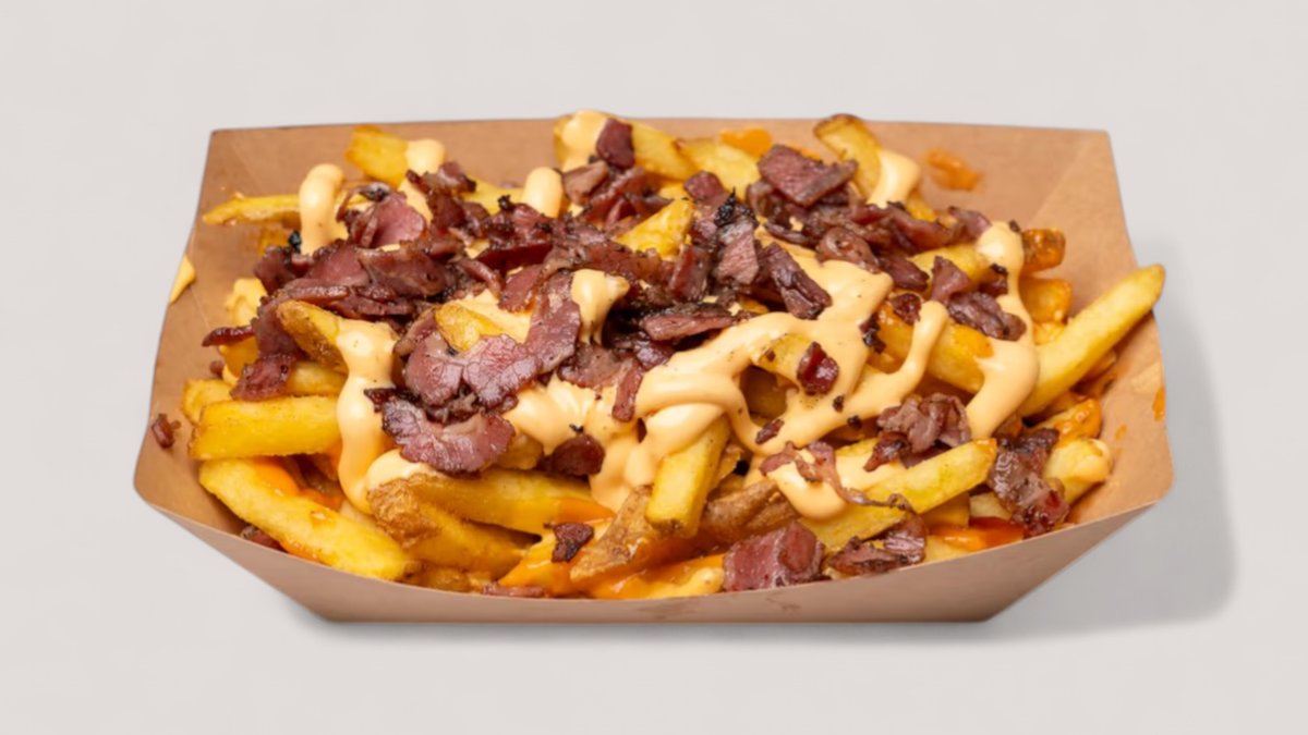 Pommes frites toppet mit cremiger Käse Soße und kross gebratenem Speck vom Rind