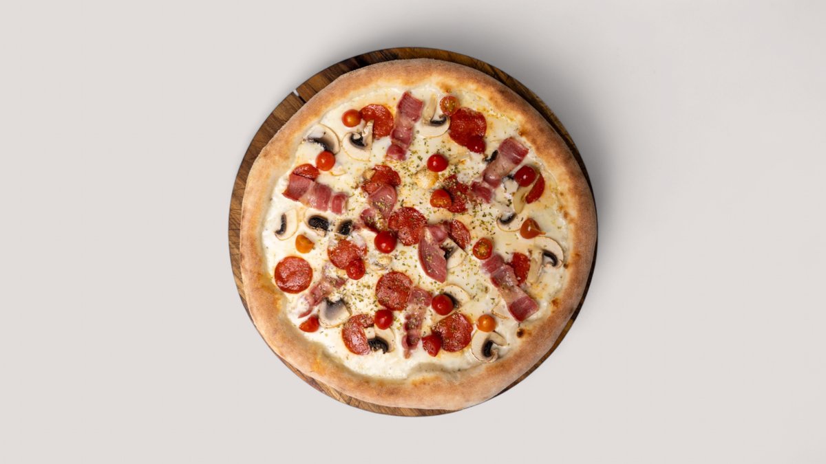 mit Creamy-Garlic-Soße, American Peperoni Salami vom Rind, Champignons, Speck vom Rind, Basilikum und frischen Kirschtomaten