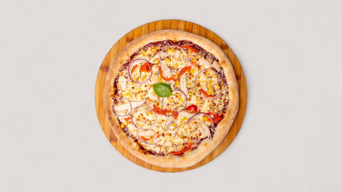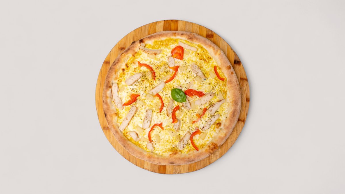 mit Hänchenbrustfilet, Jalapeños, roten Zwiebeln, Paprika, Kirschtomaten, Oliven, Chili und Basilikum