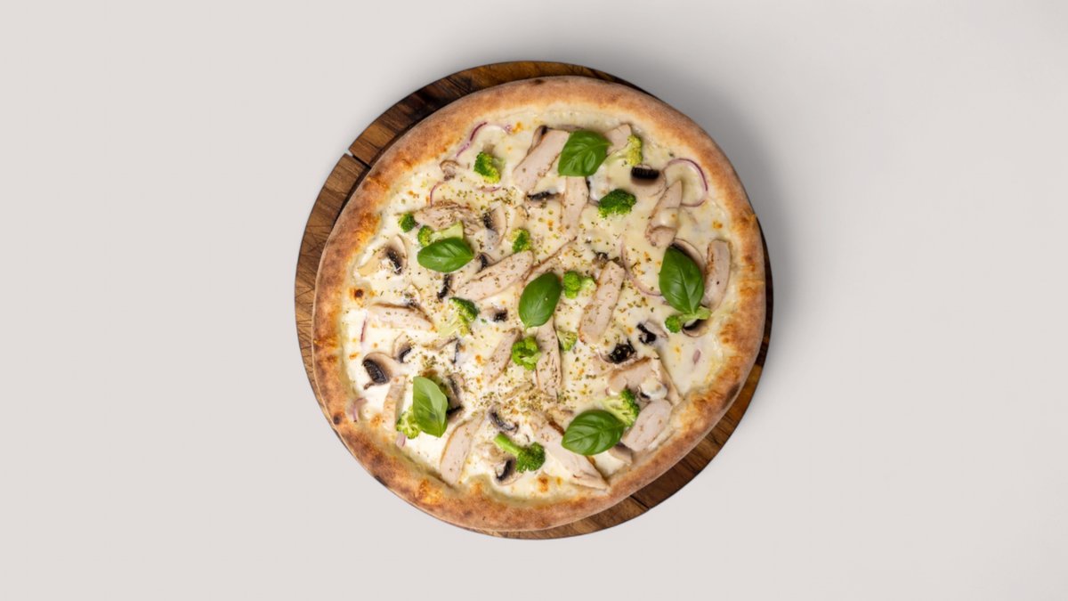 mit Creamy-Garlic-Soße, Brokkoli, Hähnchenbrust, roten Zwiebeln und Basilikum