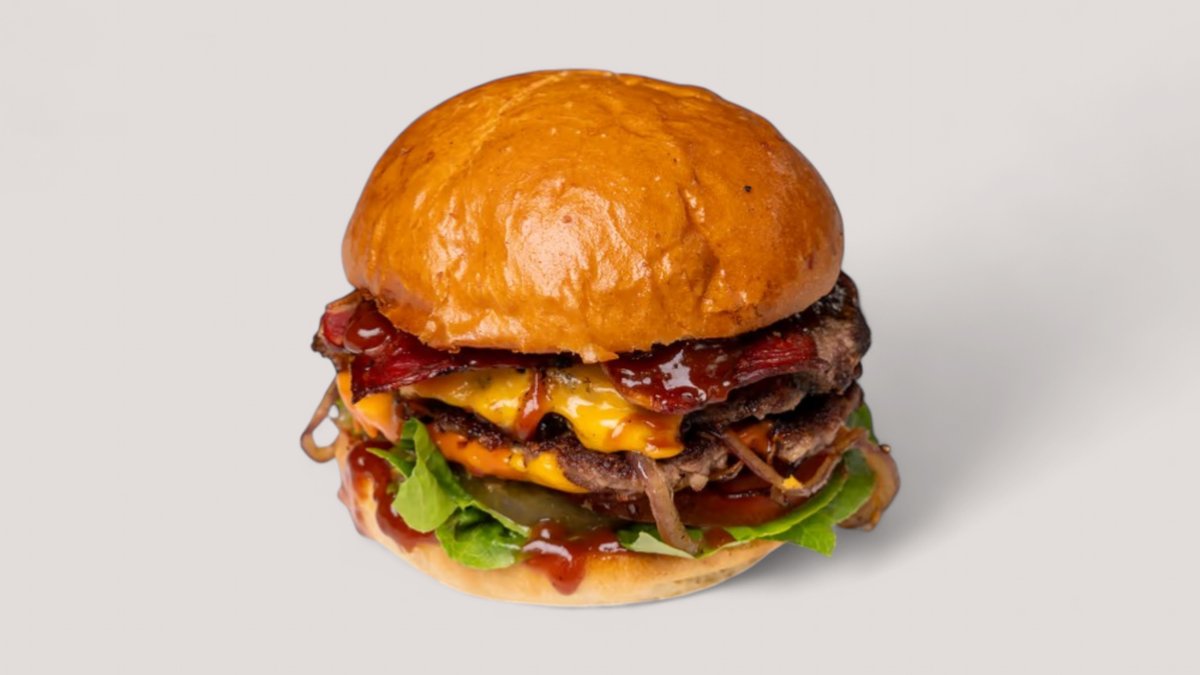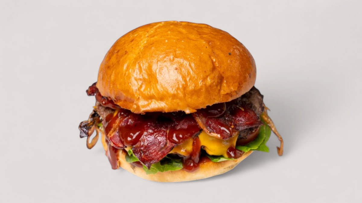 mit schmelzendem Käse, gegrilltem Speck, Tomaten, Salat, roten Zwiebeln, Käsesoße und Burgersoße