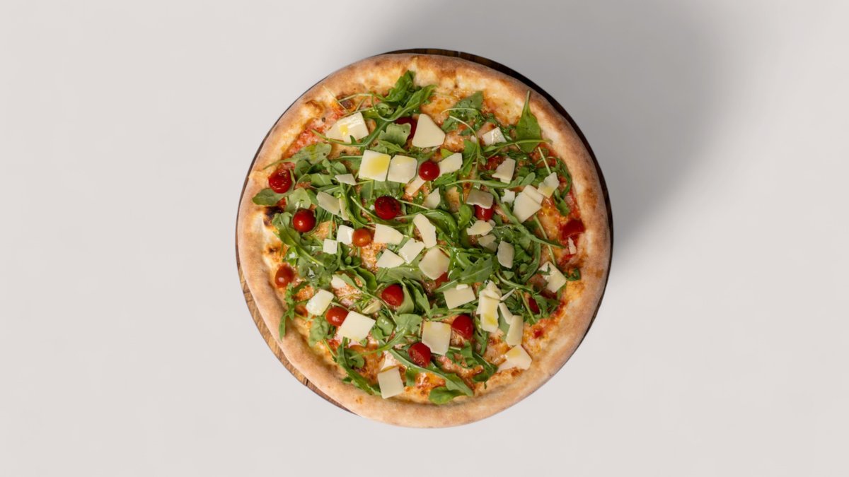 mit doppeltem Mozzarella, Kirschtomaten, Rucola, gehobeltem Parmesan und Olivenöl