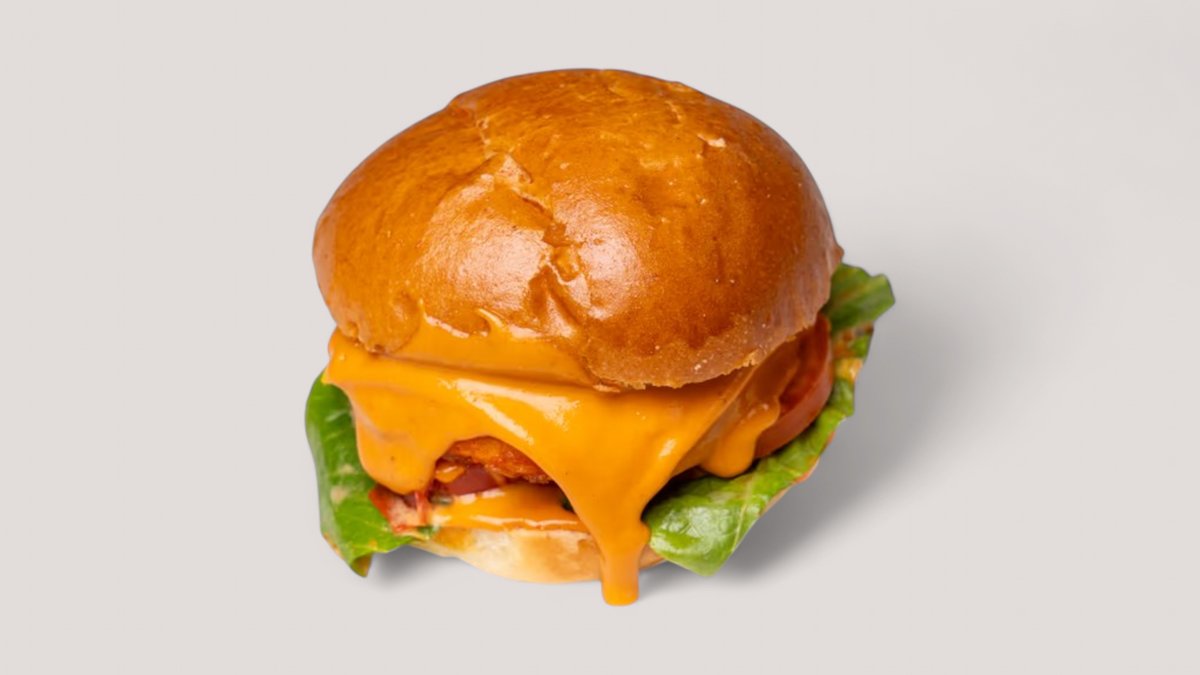 mit Brioche Brötchen, Schmelzkäse überbacken, knusprigem Hähnchen, Salat, Tomaten und cremiger Mayonnaise